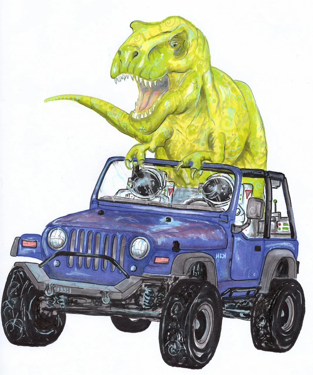 In a similar vein, I have sketched a T-Rex on the bumper, a heavy, intimidating burden that I carry wherever I go. Just like the elephant in the room, it is impossible to ignore, yet I often pretend it does not exist. How often do we carry such burdens, heavy and potentially dangerous, yet do everything we can to convince everyone that we have it all under control?