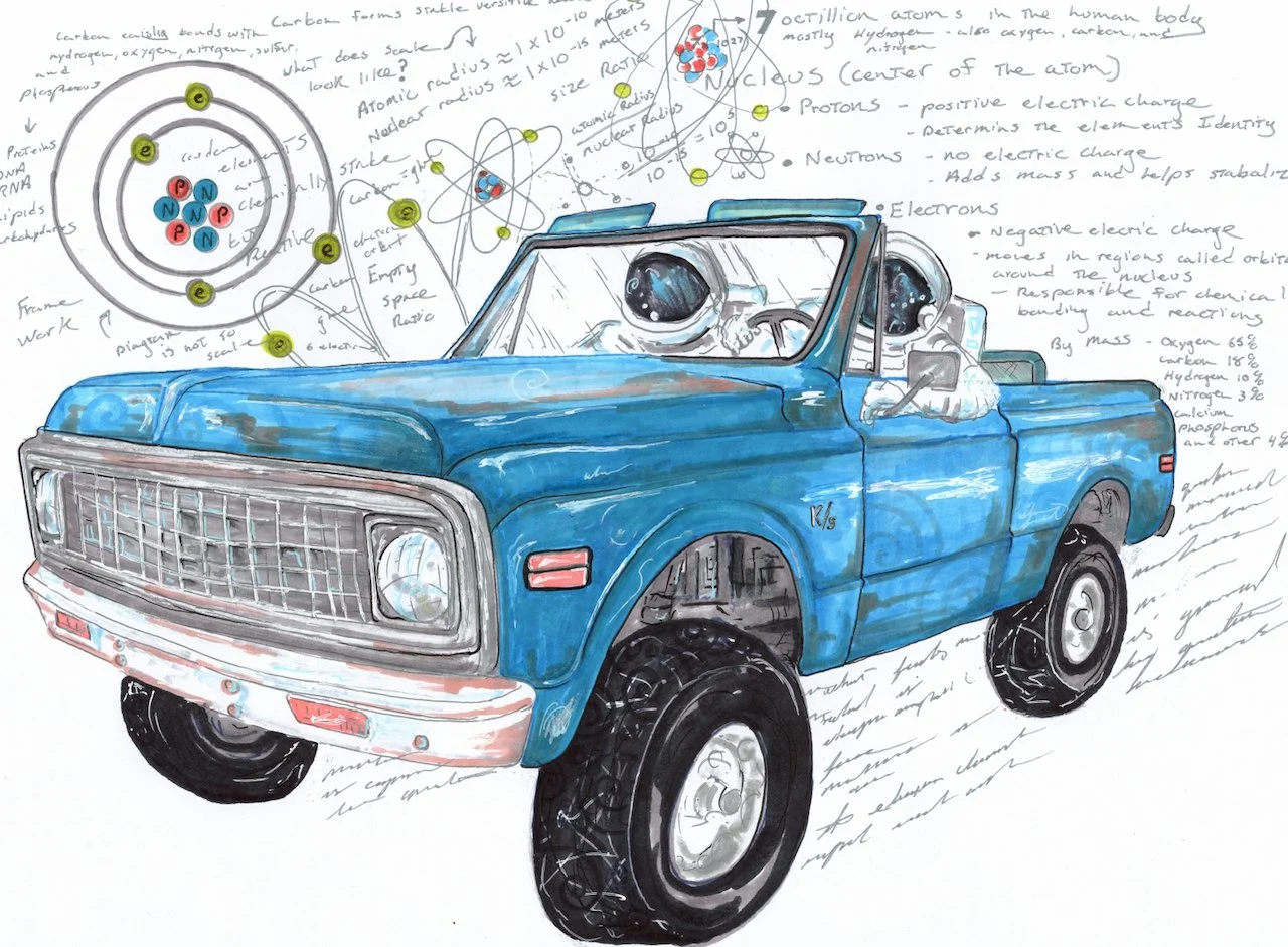 This week my imagination and Sharpie markers went down the atomic rabbit hole, asking a simple question: what are you made of? The human body is built from unimaginably small pieces, assembled with astonishing precision. The average human body contains roughly 7 octillion atoms. By mass, we are composed of about 65% oxygen, 18% carbon, 10% hydrogen, 3% nitrogen, with the remaining 4% made up of calcium, phosphorus, and other trace elements.