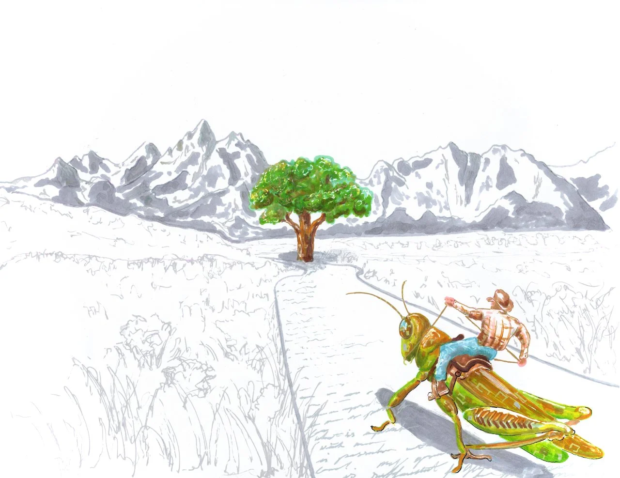 I suppose this is the very reason I selected a grasshopper riding cowboy for this week’s drawing. My mind often longs to go back, but lacking a proper time machine, I must focus on what is before me.